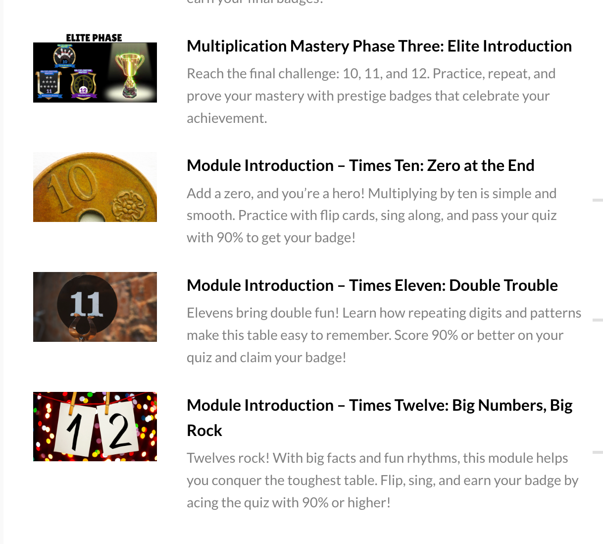 - Full Access to All 13 Modules (0–12): Unlock every times table with lessons that combine song, strategy, and repetition. Each module builds on the last, guiding learners from foundational understanding to full fluency.